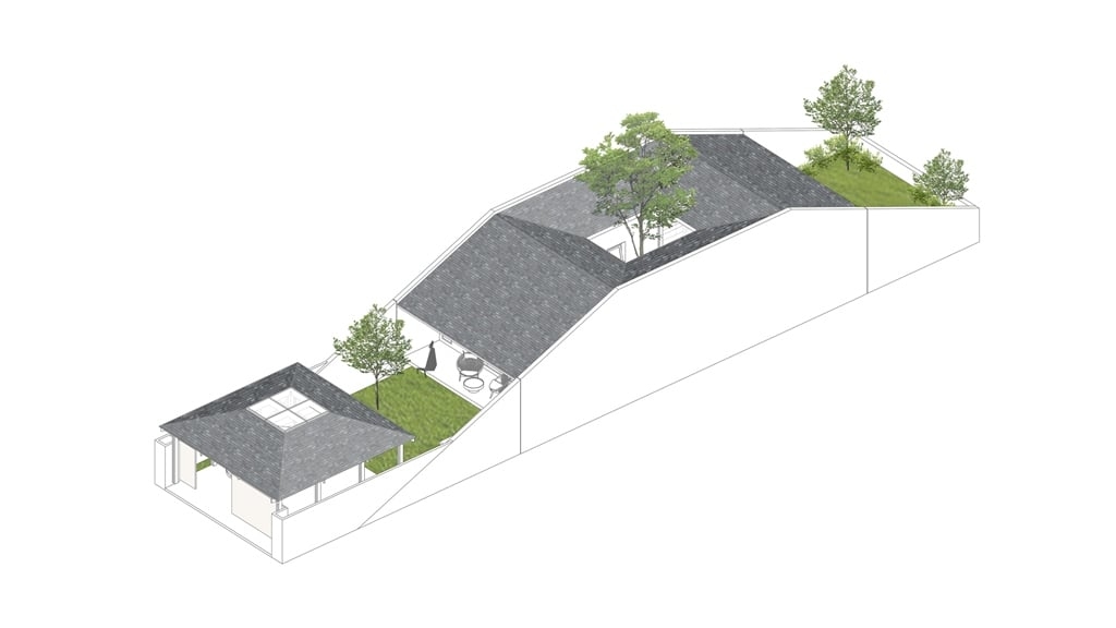 Hướng tới sự gần gũi và tự nhiên, công trình sử dụng những vật liệu tạo cảm giác thô mộc như ngói, đá rửa, gỗ sồi, bê tông kết hợp với nhiều cây xanh.
