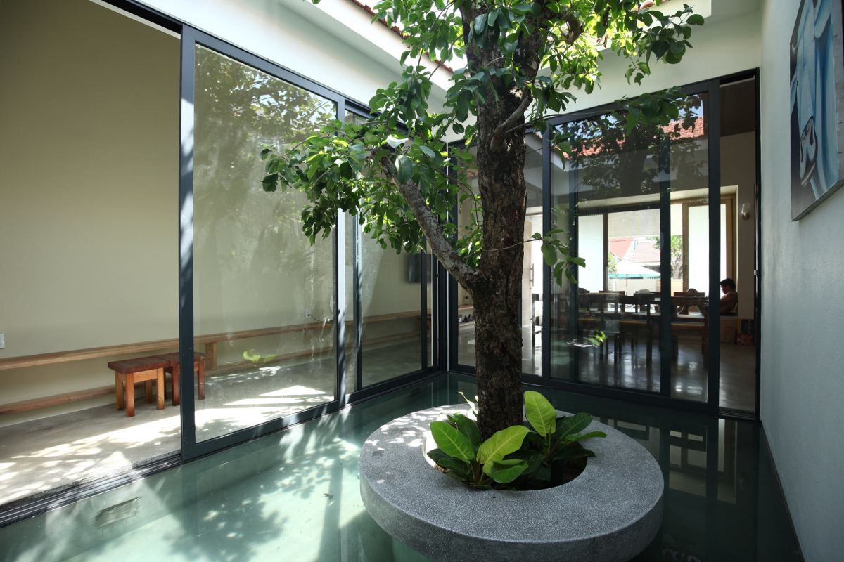 Giữa nhà, các kiến trúc sư bố trí giếng trời với hồ nước. Ngoài mục đích tăng thẩm mỹ cho công trình, khu vực này điều hòa vi khí hậu, làm mát nhà trong những ngày nắng nóng