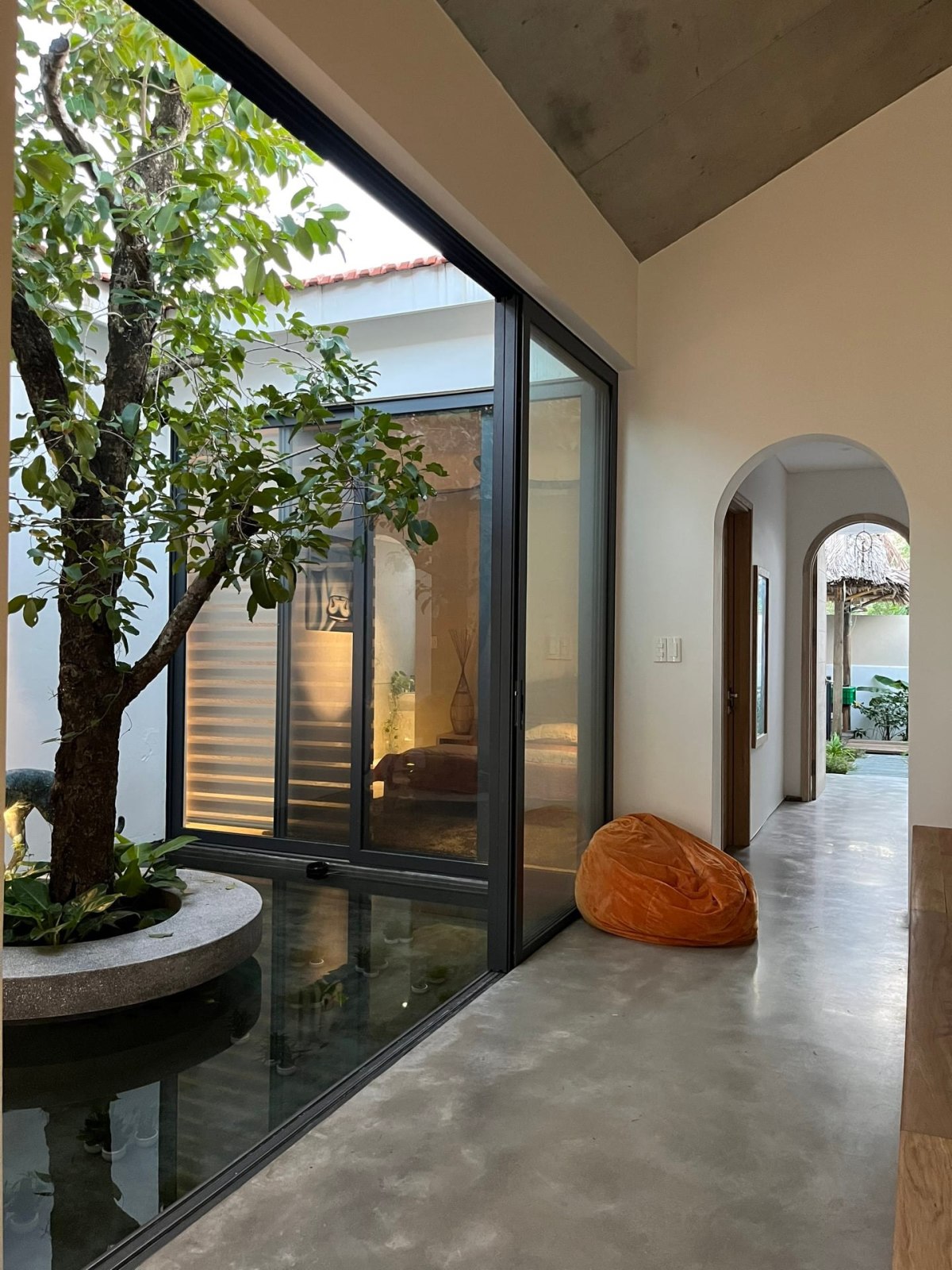 Phòng ngủ nhìn thẳng ra giếng trời cùng hồ nước, ngoài cửa kính và rèm còn có thêm cửa lưới chống muỗi để lấy gió mà chặn được côn trùng.