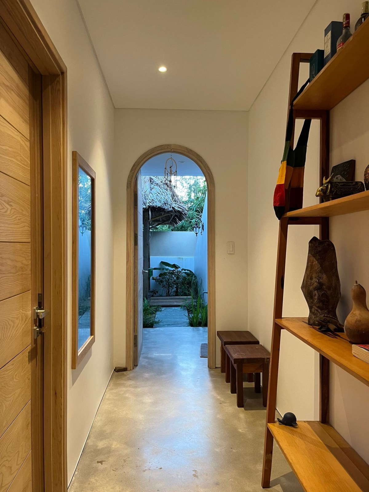 Hàng hiên trước nhà làm bằng đá rửa, lấy ý tưởng từ màu cát biển. Phần gỗ hoàn thiện bằng dầu lau với mục đích giữ lại màu gỗ tự nhiên và hạn chế sơn PU để bảo vệ sức khỏe. Sàn, mái được đổ bằng bê tông cốt thép, tăng khả năng chống chịu với khí hậu miền Trung.