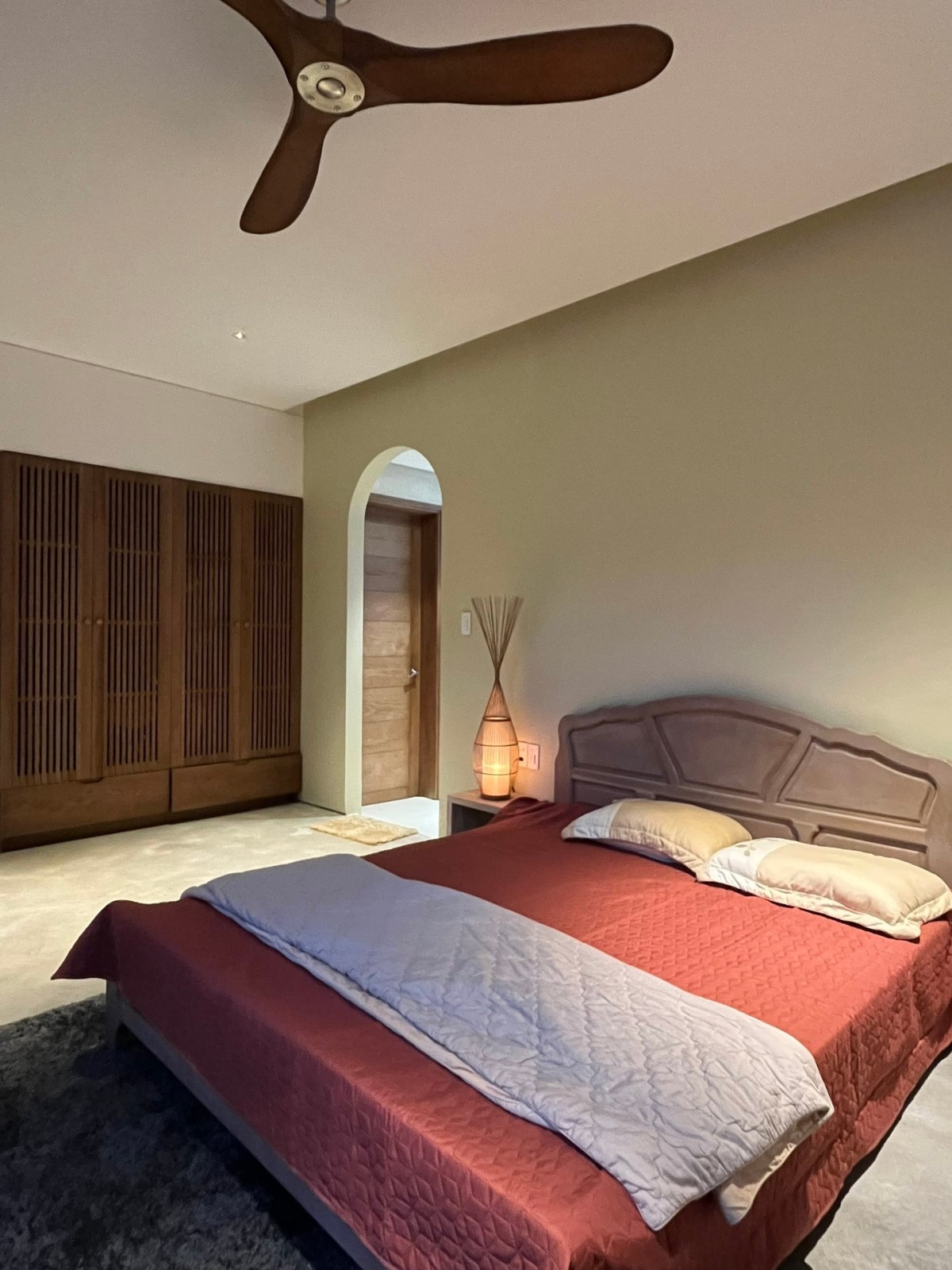 Nằm sát giếng trời và hồ nước, không gian này luôn được nhận gió nên không dùng điều hòa, chỉ cần quạt trần làm mát và trộn đều oxy trong phòng.