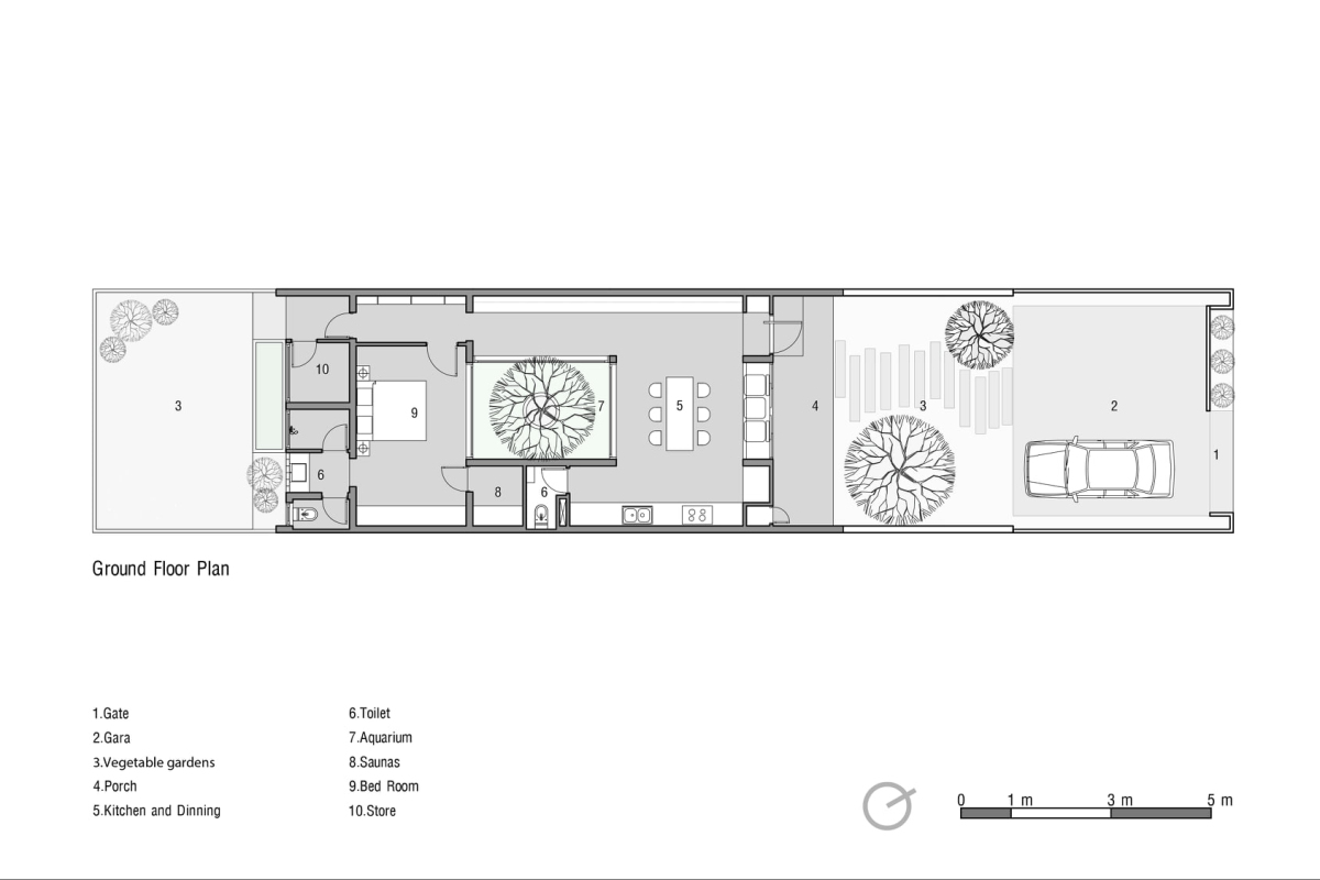 Không gian nhà gồm bốn phần lần lượt là garage để xe, vườn, khối nhà chính và vườn rau. Tổng diện tích xây dựng chiếm 120 m2.