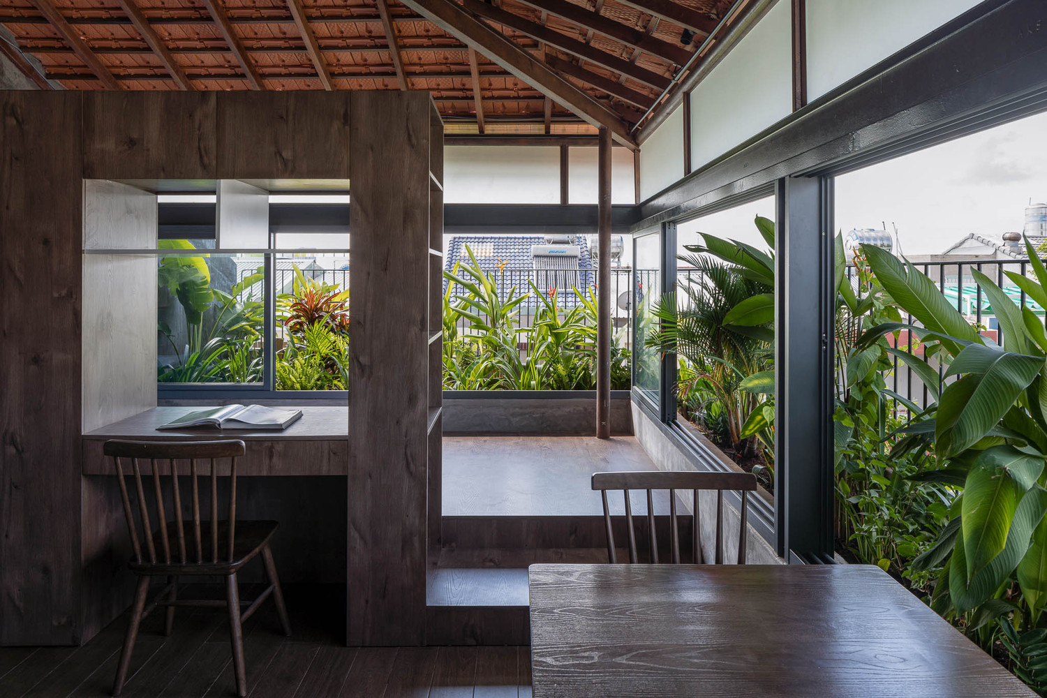 Với lợi thế view đẹp, các phòng đều được thiết kế ban công có tầm nhìn rộng. Nếu như các tầng dưới thể hiện sự năng động, trẻ trung thì căn hộ 2 áp mái lại thiên về sự mộc mạc và tối giản. Gác xép có mái ngói truyền thống khoe cấu trúc giàn, hướng tầm nhìn ra những khu vườn treo chạy dọc ngôi nhà, mang đến cảm giác không gian của một căn hộ áp mái mini. Đứng trên 2 phòng áp mái có thể phóng tầm mắt ra quang cảnh núi non của TP. Vũng Tàu.